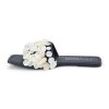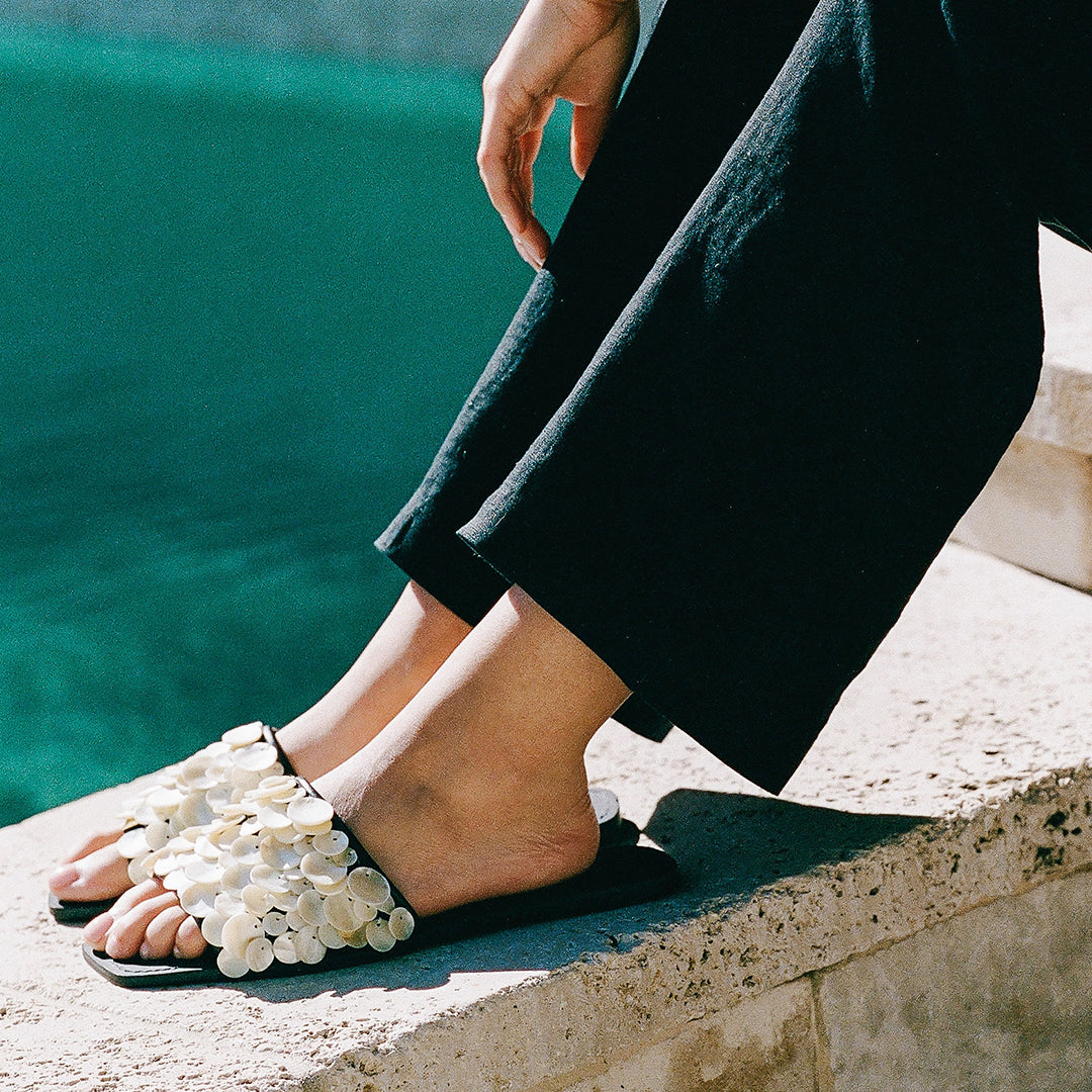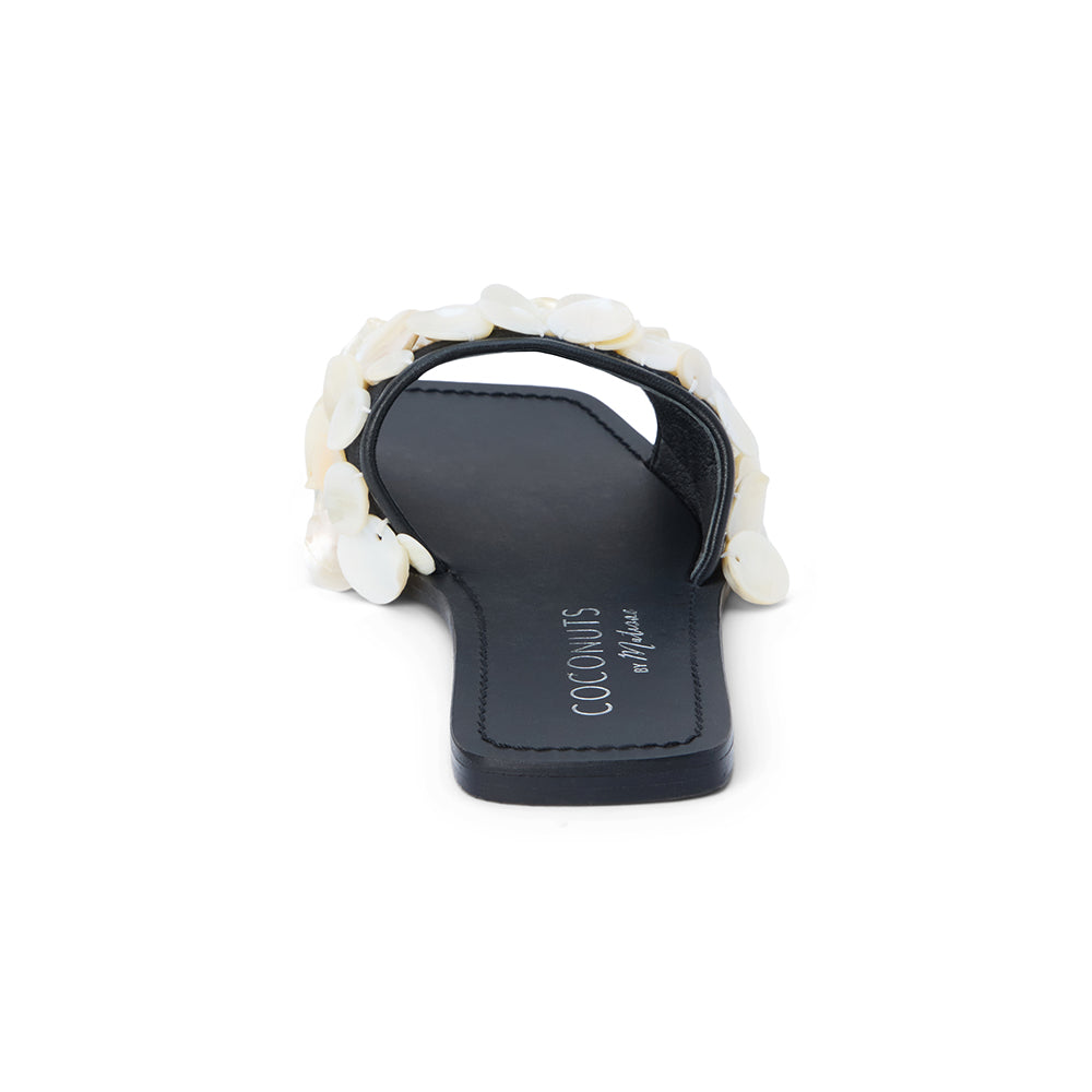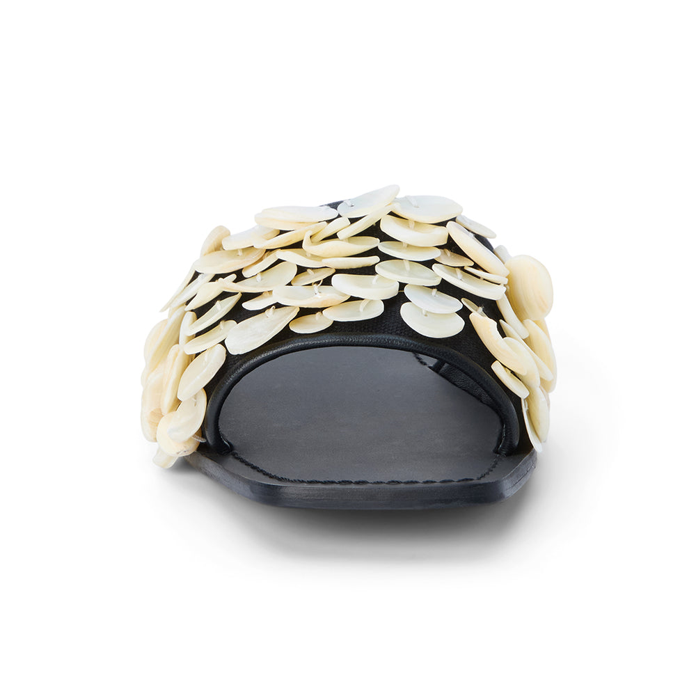Black shell-embellished slide sandals with a flat sole, square toe, and delicate stitching detail. A breezy, beach-inspired design perfect for effortless summer style.